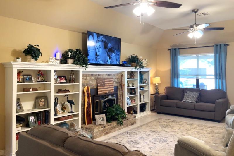 Great location near I-45, schools, & shopping yet nestled in a quiet cul-de-sac amongst mature trees. 3 bed, 2 bath, 2 car garage, climate controlled workshop with sink & exterior door to backyard, open living & dining, spacious kitchen, many cabinets & pantry, ensuite primary bedroom with shower, Bedrooms 2 & 3 share a hall bath with tub & shower, beautiful tile flooring throughout, laundry room with cabinets above & door to oversized garage. From the covered backyard patio you'll enjoy frequent visits from deer living in the nearby woods. Updates by year include: 2020-HVAC, gutters, dishwasher, range, microwave vent, hall bath toilet, lights & most ceiling fans; 2022-water heater, added insulation; 2023-garage door openers, 2024 garbage disposal, 2025-kitchen sink. Other improvements- interior & exterior caulked & painted.